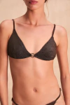 La bikini Obsidian Shiny está confeccionada en lurex con acabado brillante. Tiene corpiño en forma triangular con breteles regulables y tiras para anudar en la espalda. Cuenta con aplique metálico exclusivo de la marca en el centro delantero. La bombacha tiene laterales ajustables mediante tiras, que permiten un calce personalizado.