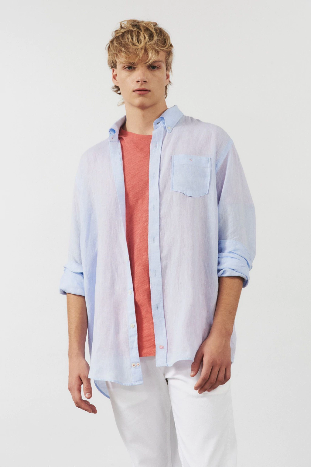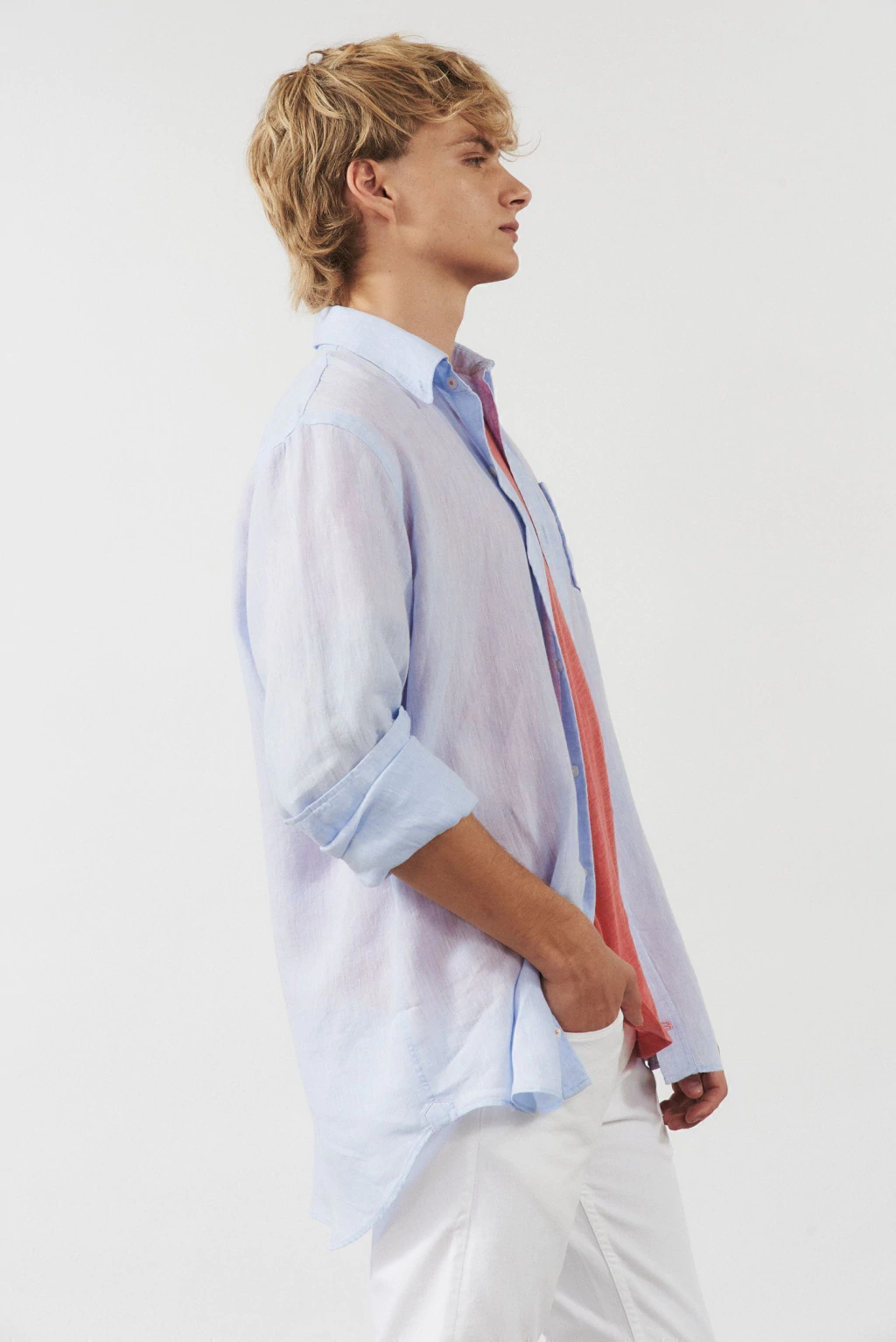 Camisa calse Classic Fit relaxed mangas largas, cuello americano con boton down. Bolsillo aplicado en delantero izquierdo. Bordado en carteron a contratono, detalle de aplique de refuerzo en bajos laterales y botones de repuesto. Tela composicion 100% lino liso. Industria Argentina.