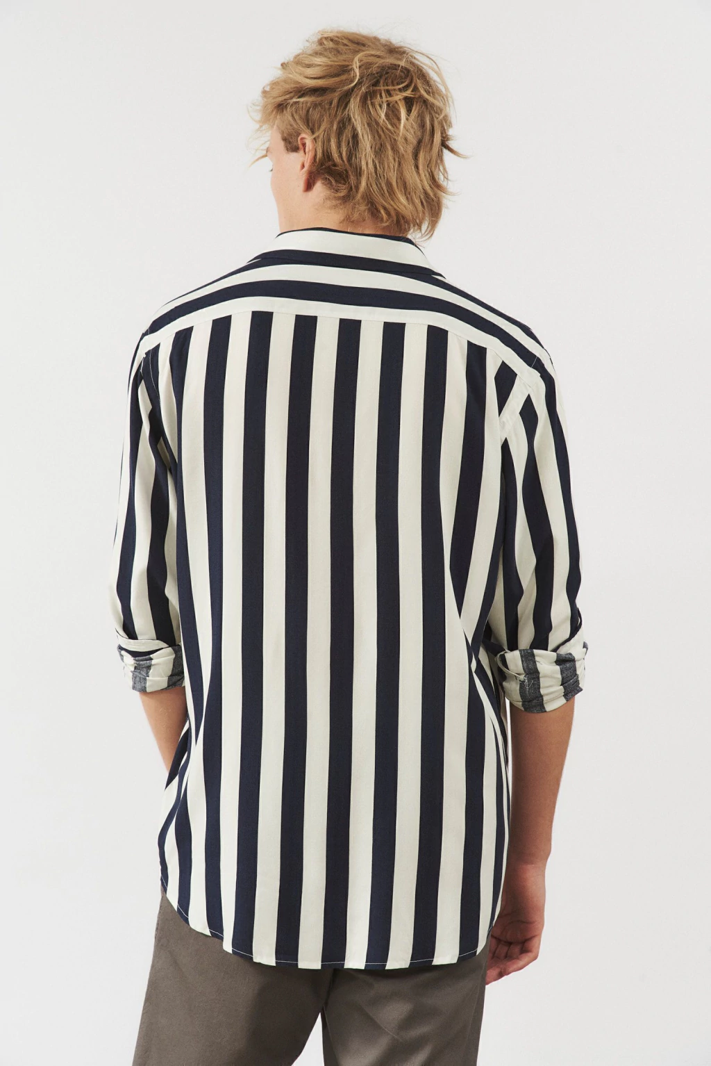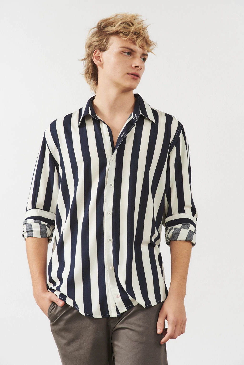 Camisa calse Classic Fit mangas largas, con cuello americano. Con detalles en contra tono y botones de repuesto. Tela composicion 100% viscosa rallada. Industria Argentina.