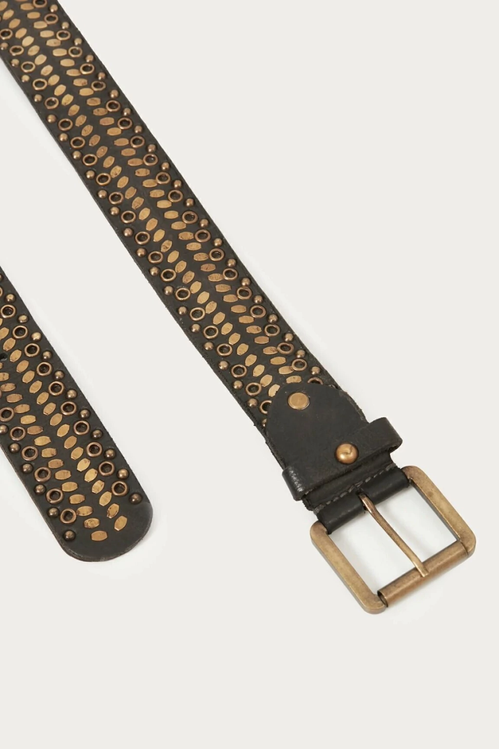 Cinturón ancho de 4,2 cm, confeccionado 100% en cuero. Diseño rocker con múltiples líneas de remaches bombée, chatos y ojalillos. Los metales y la hebilla son en baño color bronce. Para realzar cualquier look!