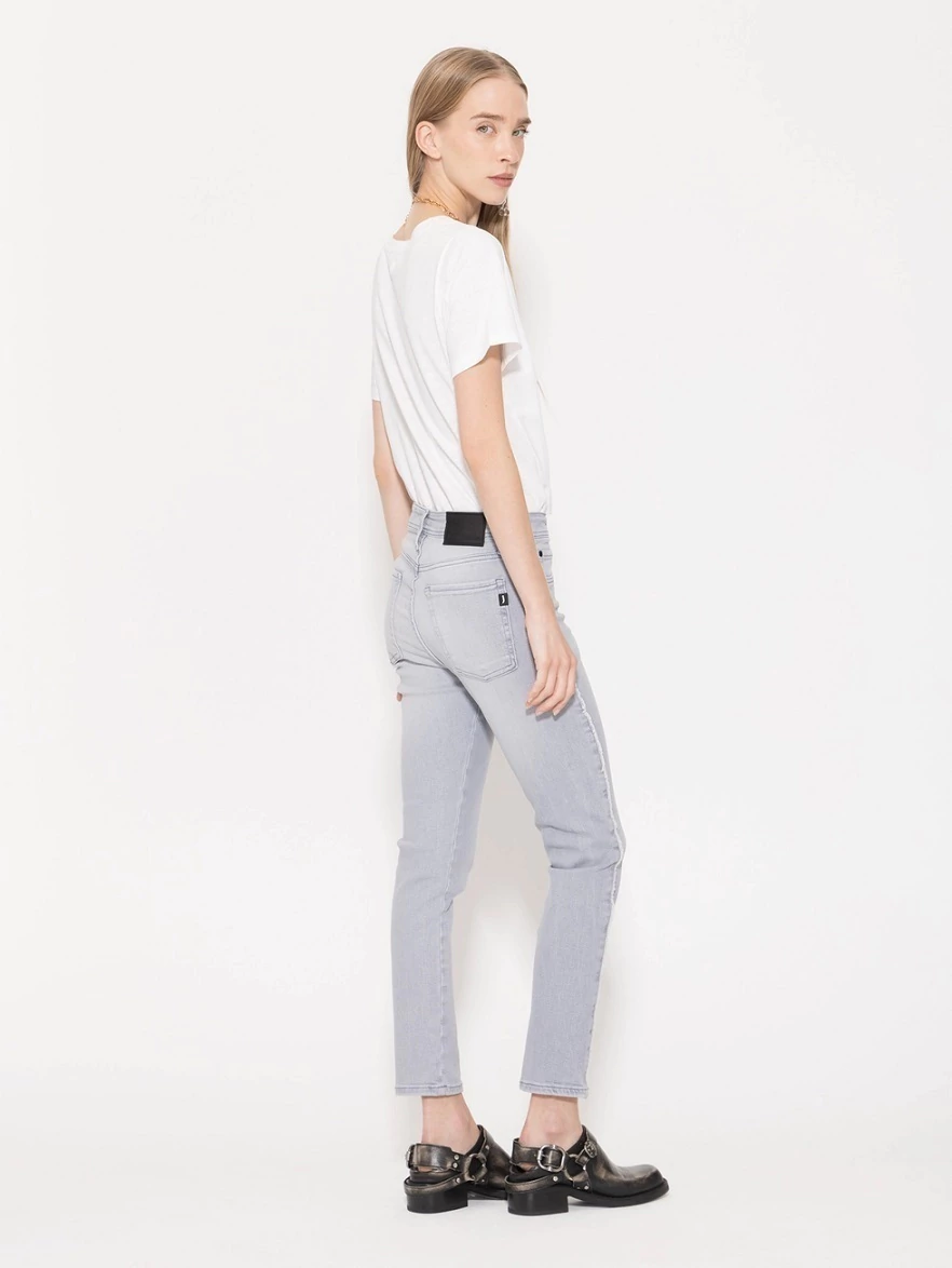 Jeans Lisa Mid Grey de fit slim, con botamanga levemente más ancha, largo al tobillo. La cintura y la cadera son más relajadas.