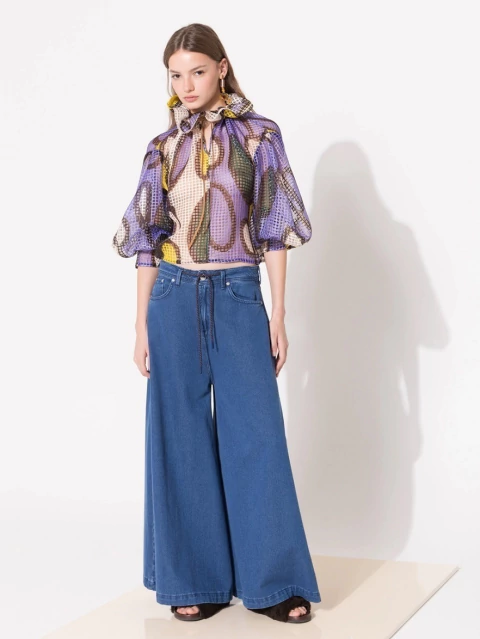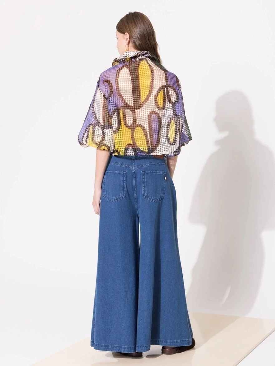 Jeans Wide Air Blue ultra ancho. El tiro es relajado y largo, calza por debajo de la cintura y queda como un medio-bajo. Viene con un cordón en la cintura para que de todas maneras se pueda calzar donde quede más cómodo. Es largo hasta el piso y viene en un tejido con mucha caída y poca estructura lo que lo hace comodísimo.