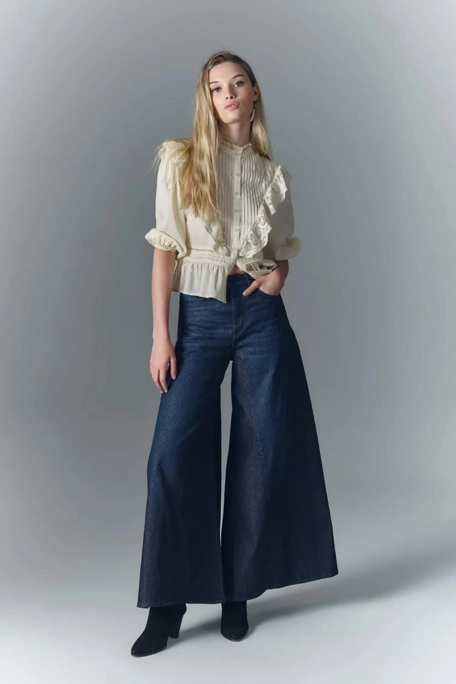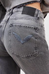 Jean de cintura alta y pierna ultra ancha, una moldería que comienza a ensancharse de forma marcada a partir de la cadera hasta llegar al ruedo. Confeccionado en denim confort, con un pequeño porcentaje de elastano, y un lavado azul oscuro que le da un look sastrero. Con un recorte en las piernas y en el tiro, la gran dimensión de sus piernas hacen que tenga mucho vuelo. En los bolsillos traseros lleva nuestro icónico bordado de alas. Con cierre y botón frontal, forrería en bolsillos estampada con logo de la marca.