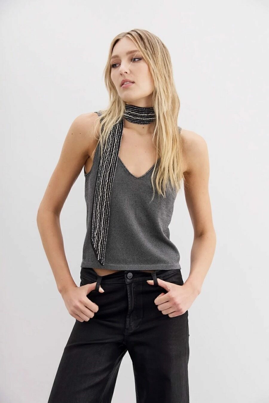 Tejida en hilo de lurex, la musculosa cobre es la combinación ideal entre líneas simples y espíritu rock. La textura metalizada suma glam, mientras que su calce al cuerpo y el escote en frente y espalda resaltan la silueta de este básico versátil y canchero.