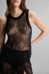 La musculosa Back To Black tiene calce regular con cuello redondo y sisas tejidas. Su diseño destaca por su confección en encaje con un delicado motivo floral, complementado con una lluvia de hotfix a tono.