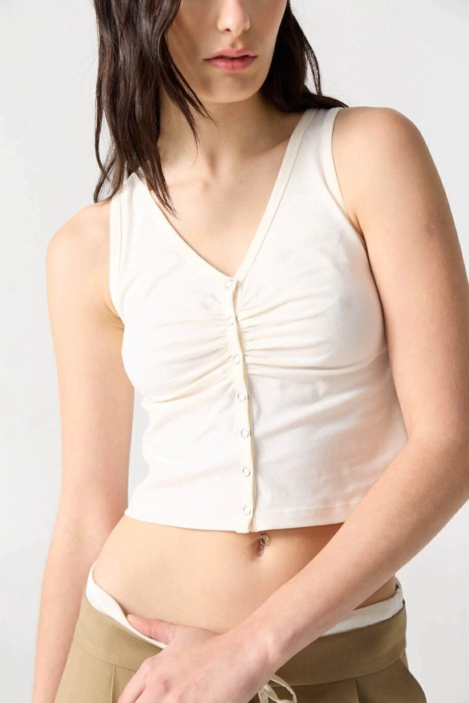 Descubrí la MUSCULOSA APULIA, una musculosa ajustada al cuerpo que realza tu figura con elegancia. Presenta un escote en V y una concartera con broches metálicos que facilitan el ingreso de la prenda, además de frunces en el busto que aportan un detalle femenino y sofisticado. Confeccionada en textil de algodón elastizado, garantiza comodidad y un ajuste perfecto para todo el día. Ideal para combinar con prendas tanto casuales como formales.