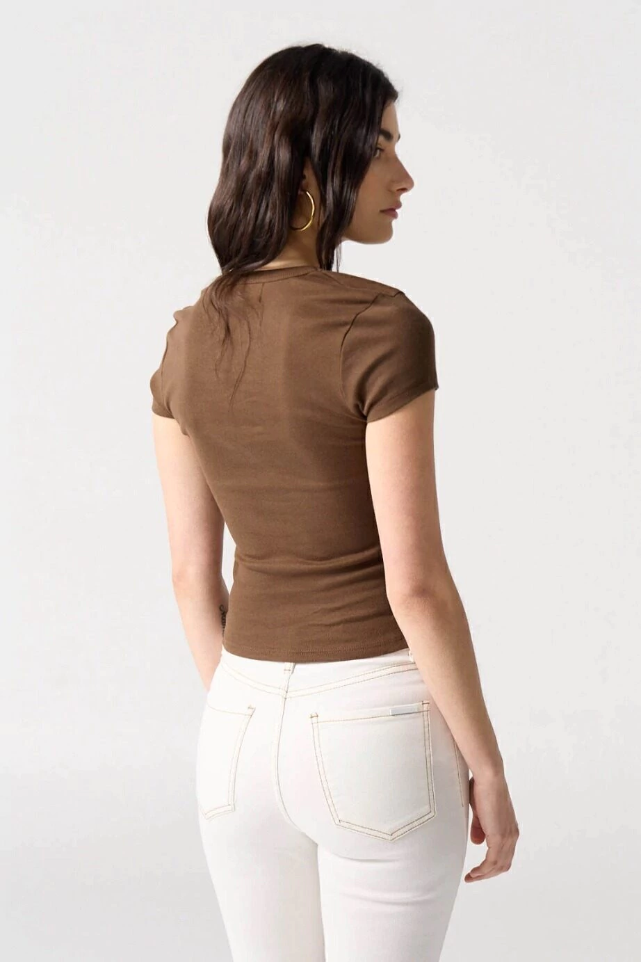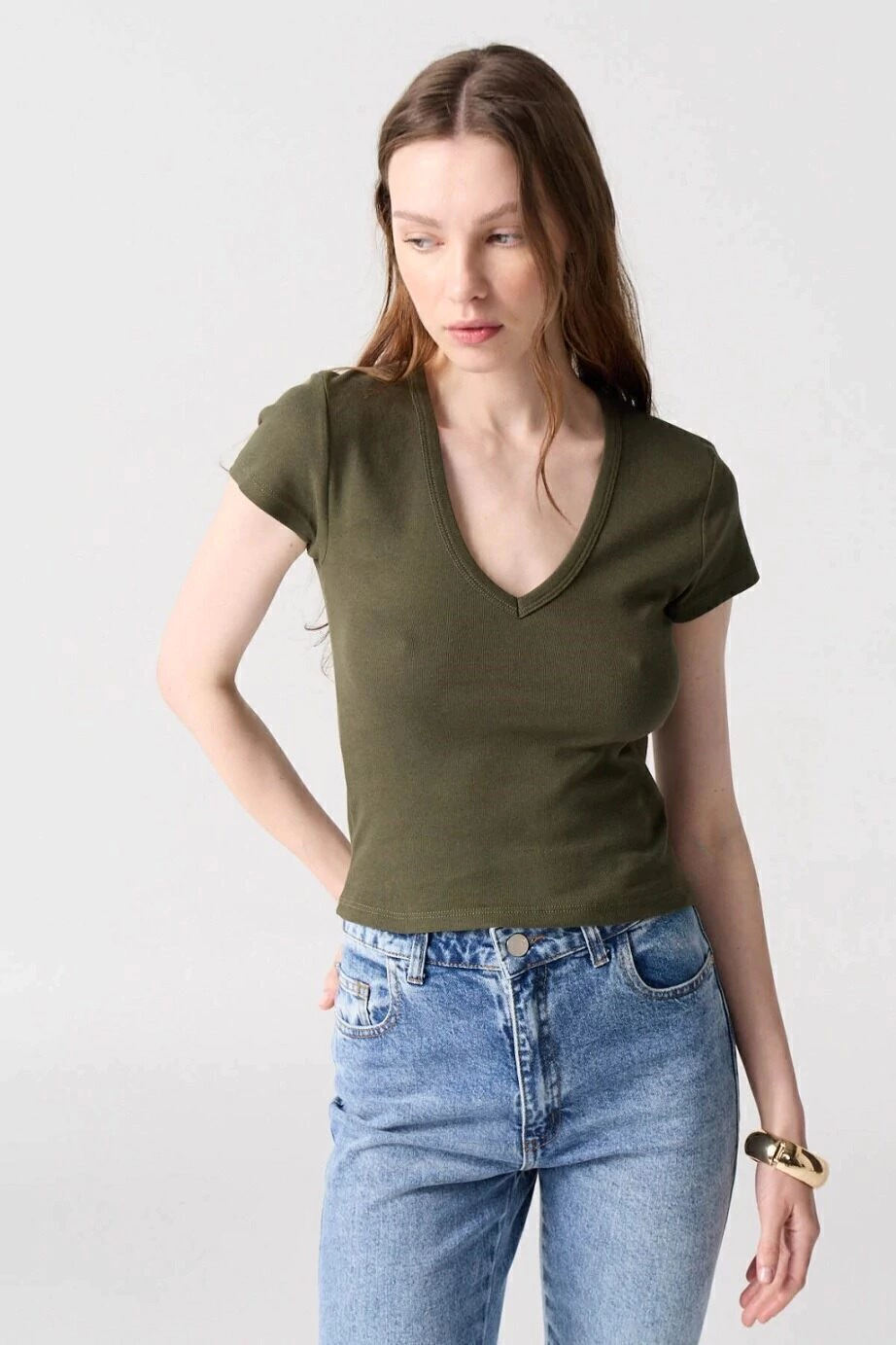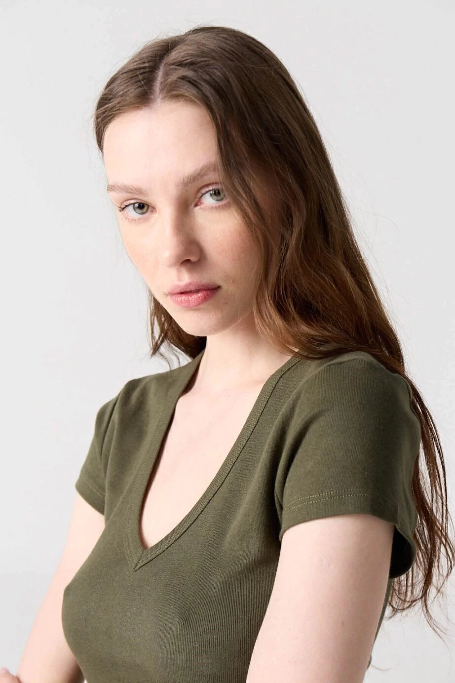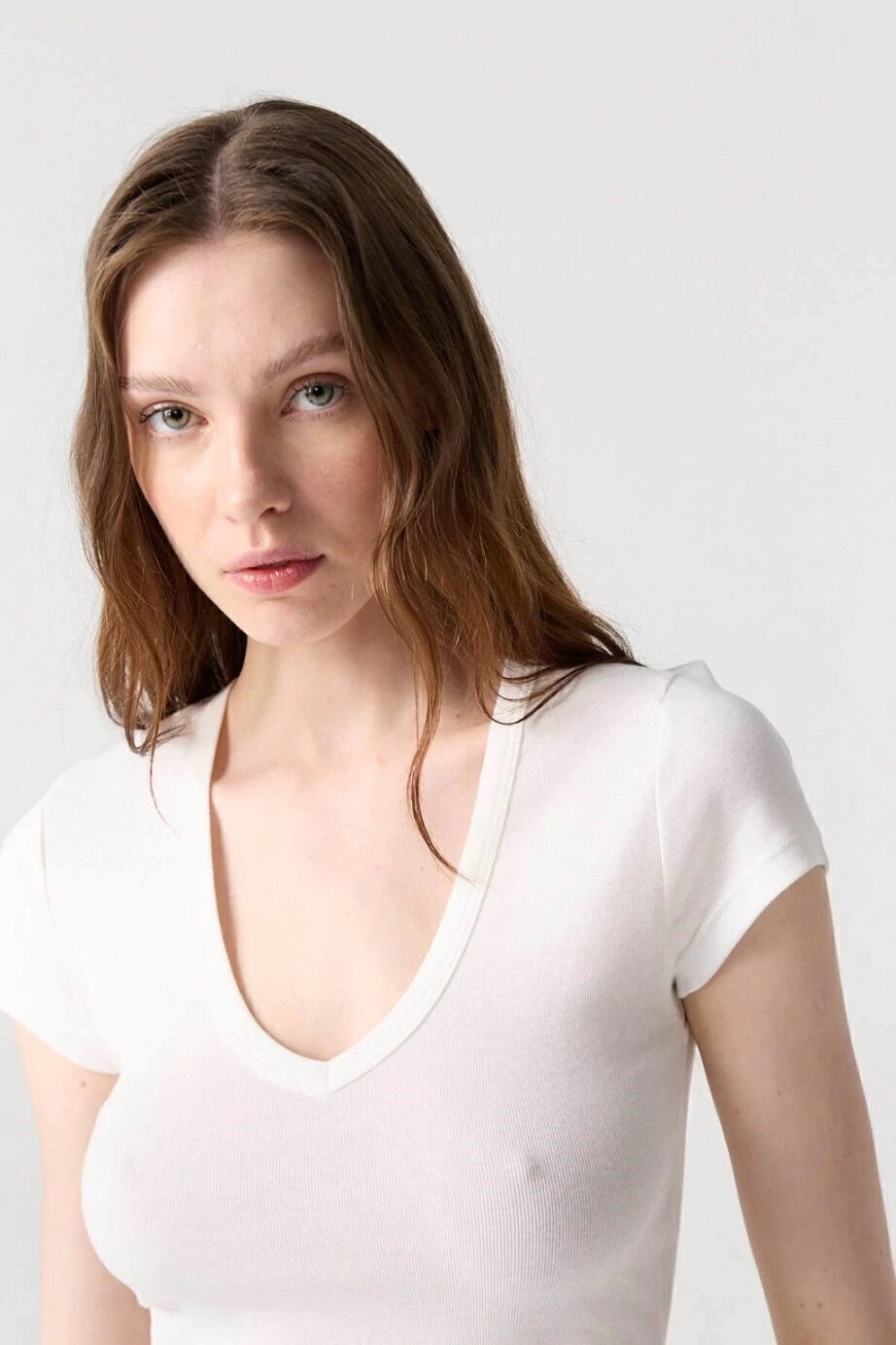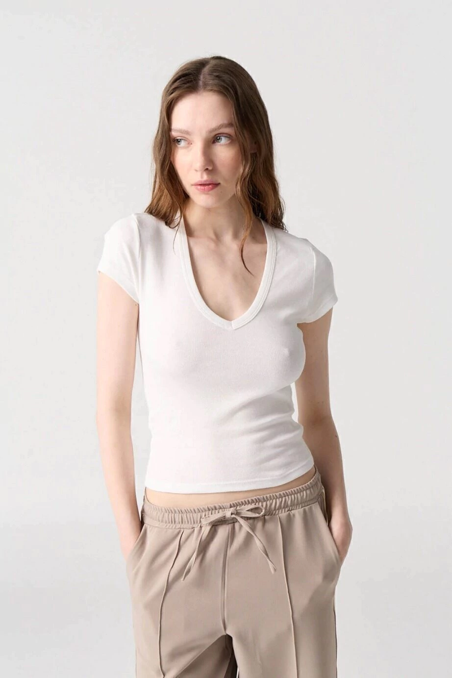 Descubrí la prenda Eleonora: una remera al cuerpo con manga corta y escote en V que resalta tu estilo con un toque femenino y moderno. Su largo hasta la primera cadera y la suavidad del algodón reeb la convierten en una aliada versátil y cómoda para acompañarte en todos tus días.