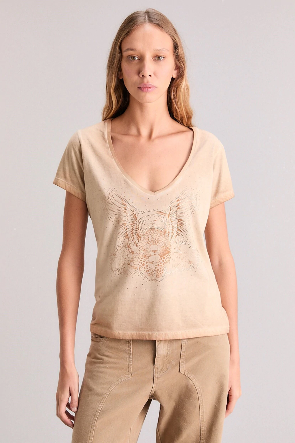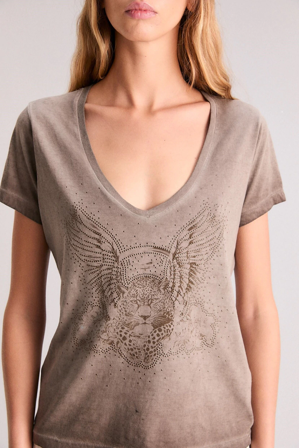 La remera Flying Beast tiene un calce regular con escote en V y manga corta. Posee estampa exclusiva de la coleccion con detalles customizado con hotfix aplicadas mediante termofusión, una técnica que asegura su fijación y durabilidad. Esta confeccionada en jersey de algodón con teñido fade.