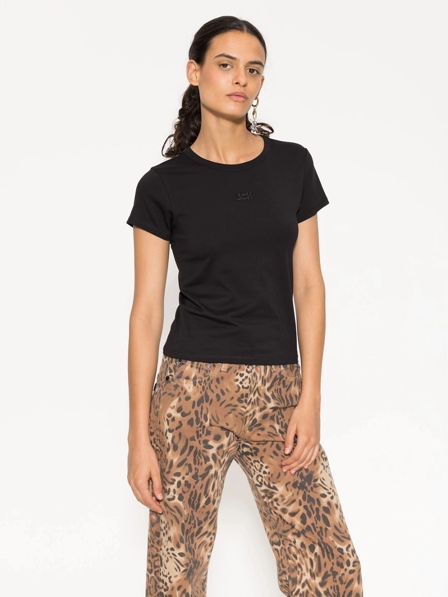 Remera Luna de fit al cuerpo, manga corta y cuello redondo. Es larga a la primera cadera. Lleva logo bordado en delantero.