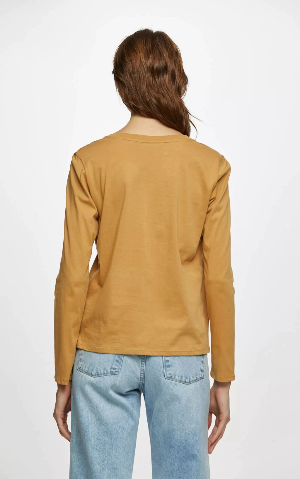 Remera de punto, manga larga, de silueta recta, largo por arriba de la cadera y con cuello en redondo a la base. Lleva corona bordada en el delantero.