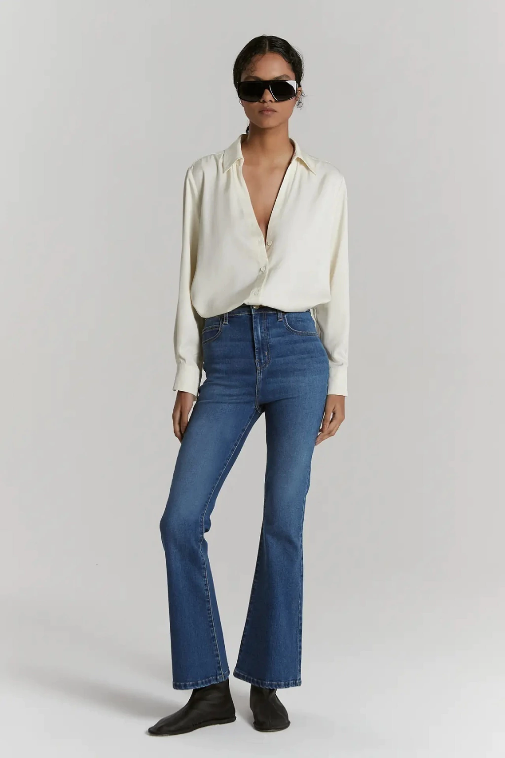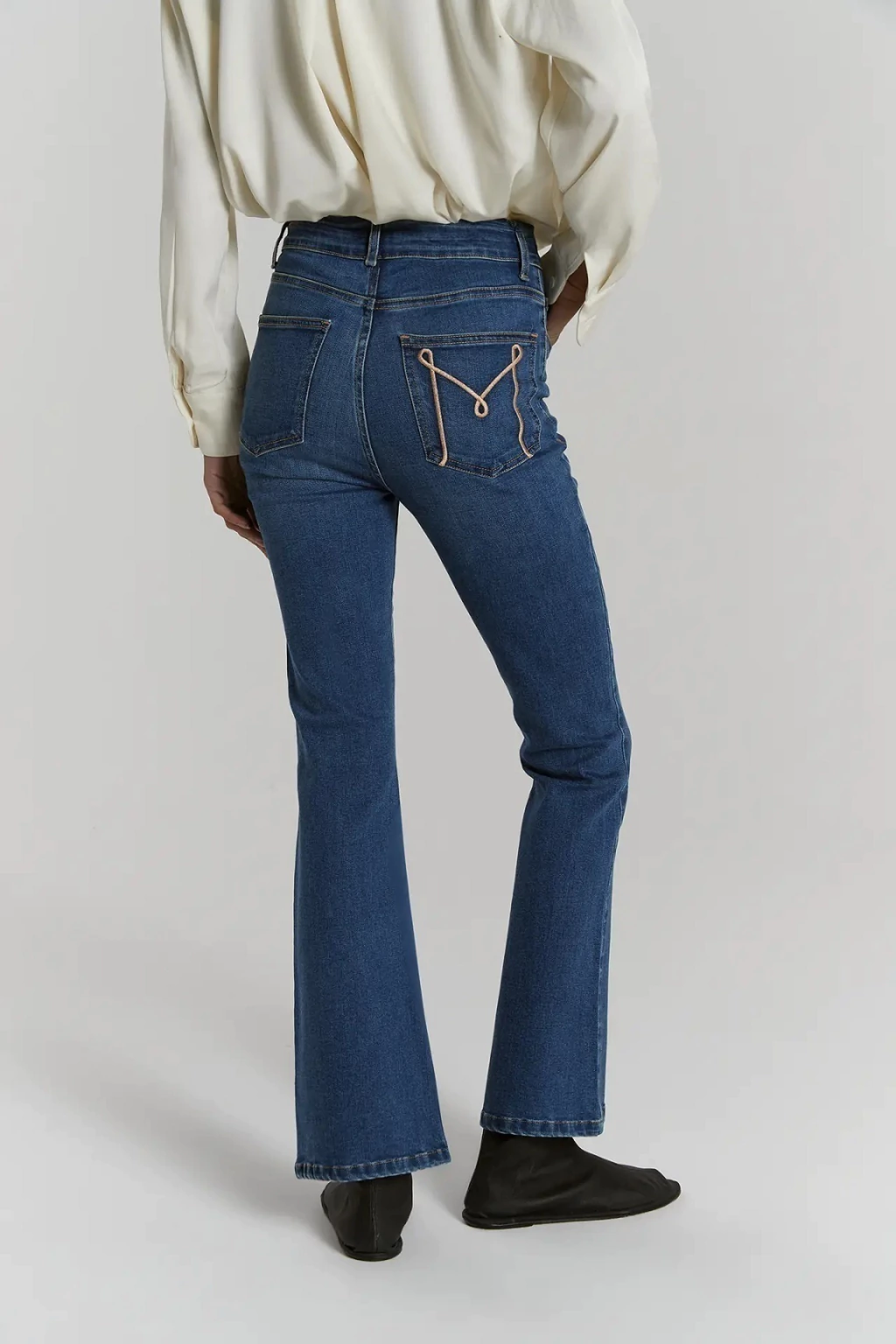 Jean de tela importada en color celeste. Mid rise, largo crop, con bota acampanada y calce ajustado. Tiene la alegoría de María Cher en bolsillo espalda. Lavado stone wash con bigotes y localizado. 70% Algodón 25,5% Poliéster 3% Viscosa 1,5% Elastano. Cuidados especiales: Requiere lavado del revés.