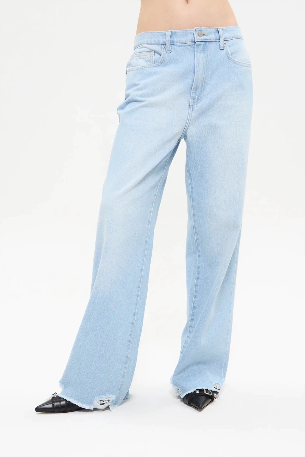 Pantalón de denim rígido, de tiro medio y pierna recta. Lavado celeste con localizado suave y bigotes. Con badana de denim bordada. Ruedo desflecado. 100% ALGODON Lavado a mano con agua fria. No usar cloro. Plancha suave. No retorcer. Secar en plano a la sombra.