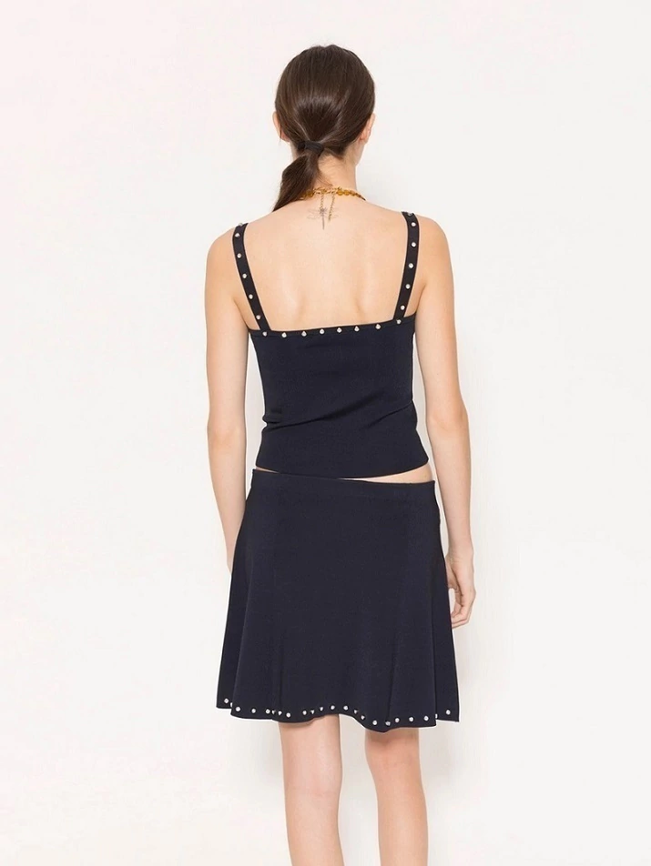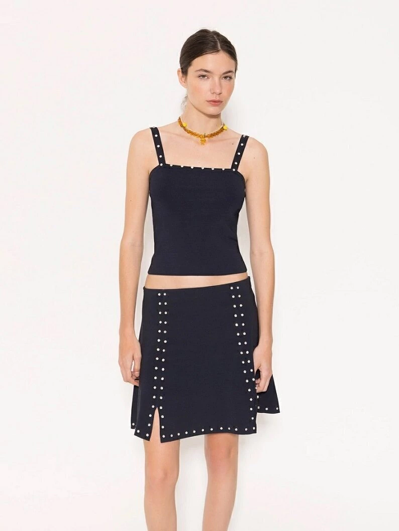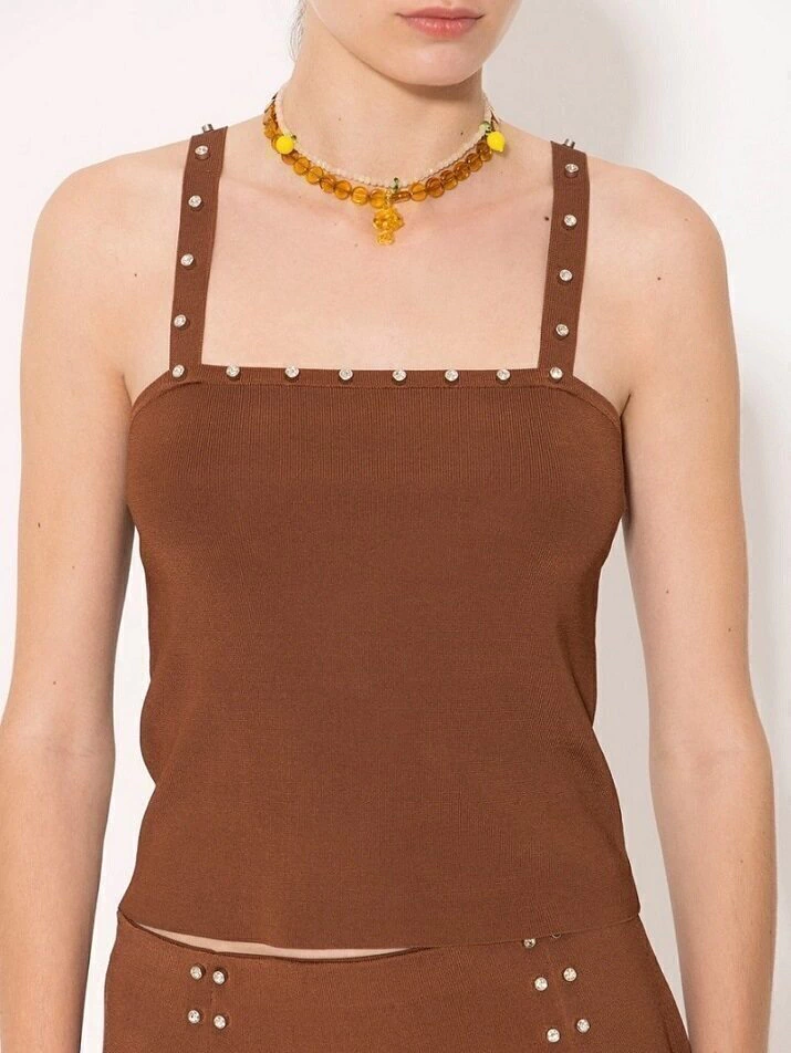 Top Jazz al cuerpo, largo hasta la primera cadera, con breteles y detalle de piedras en el escote que suman un toque sofisticado al diseño.